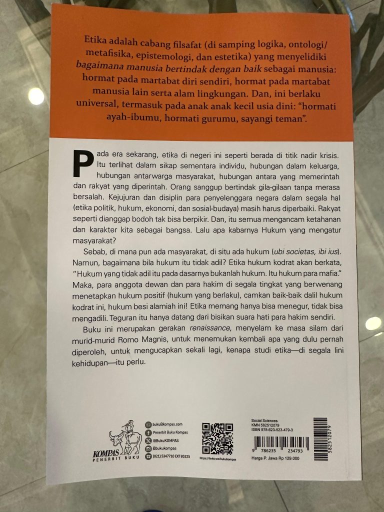 Di tengah keriuhan zaman yang ditandai dengan runtuhnya kepercayaan publik terhadap institusi, merebaknya korupsi, ketidakadilan hukum, serta banalitas politik dan media sosial, hadir sebuah buku penting yang tak sekadar mengajak kita membaca, tetapi mendorong kita merenung dan bertanya ulang: “Masih adakah tempat bagi etika dalam kehidupan kita hari ini?”