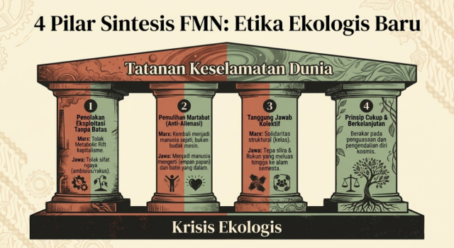 Sintesis ini kemudian diarahkan pada krisis ekologis. Jika Marx mendiagnosis penyakit struktural, maka etika Jawa menawarkan landasan etis untuk penyembuhan.